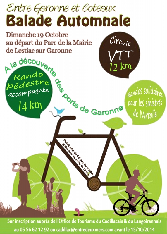 | Description : | 2 balades s'offrent à vous : - une randonnée pédestre de 14 km à la découverte des ports de Garonne. Rendez-vous à 8h à Lestiac avec accueil-café, organisation du covoiturage pour aller vers Sainte Croix du Mont point de départ de la randonnée. Haltes commentées à Sainte Croix du Mont, Loupiac, Cadillac, Rions, Paillet et Lestiac avec l'intervention d'associations locales (Les Jardins de la Citadelle, la Peishota, La Cale, La guinguette du Phare, l'association de Sauvergarde de Rions). Pique-nique tiré du sac à 13h dans la cour de l'école de Rions. Arrivée à 16h30 à la guinguette du Phare à Lestiac avec marché BIO. Pour les cyclistes balade de 12 km environ pour les adeptes du vélo, entre vignoble et bois : départ à 8h30 depuis Lestiac, point de ravitaillement à Tabanac puis à l'arrivée. Une partie des recettes sera reversée aux sinistrés de l'Artolie. |