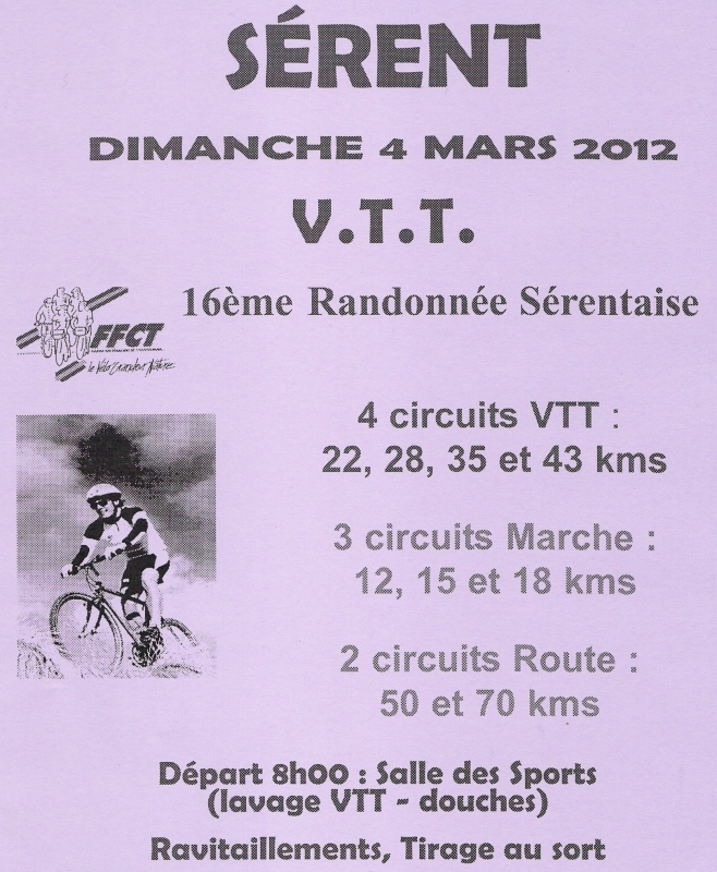 | Description : | Départ / arrivée salle des sports de Sérent 3 circuits VTT : 22, 28, 35 et 45km 3 circuits pédestre : 12, 15 et 18km 2 circuits cyclo : 50 et 70km |