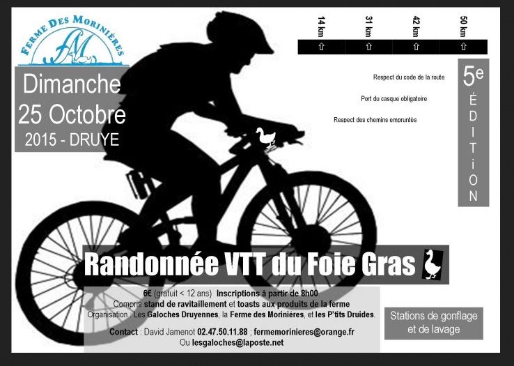 | Description : | VTT 14-31-42-50 kms L'inscription comprend un accès libre à la dégustation des différentes terrines de la ferme à l'arrivée et surtout à une assiette de dégustation gastronomique avec foie gras et verre de vin moelleux. |