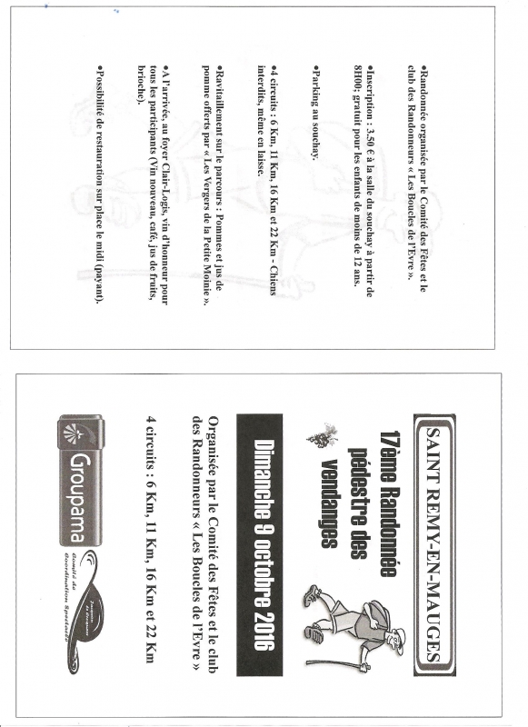 | Description : | 4 circuits de 6 à 22 km sur les sentiers rémygeois Ravitaillement sur parcours et vin d'honneur à l'arrivée : vin nouveau, jus de fruits, brioche |
