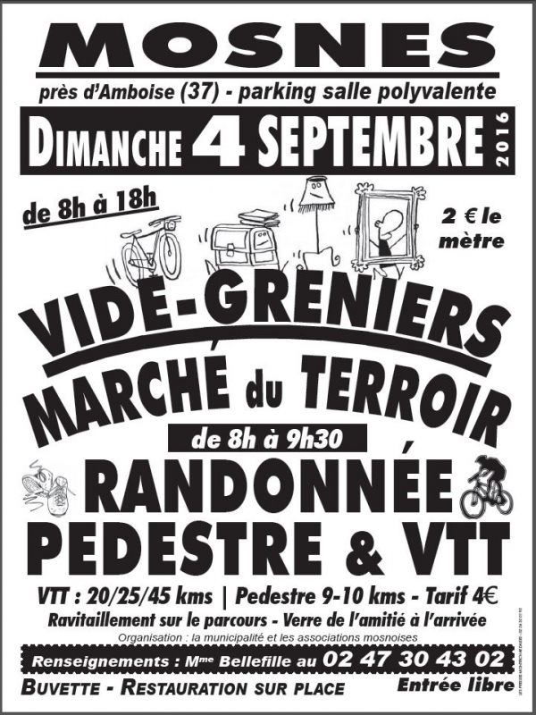 | Description : | VTT 220-25-45 kms pédestre 9-10 kms Ravitaillement sur les circuits Verre de l'amitié à l'arrivée Vide grenier et marché du terroir |