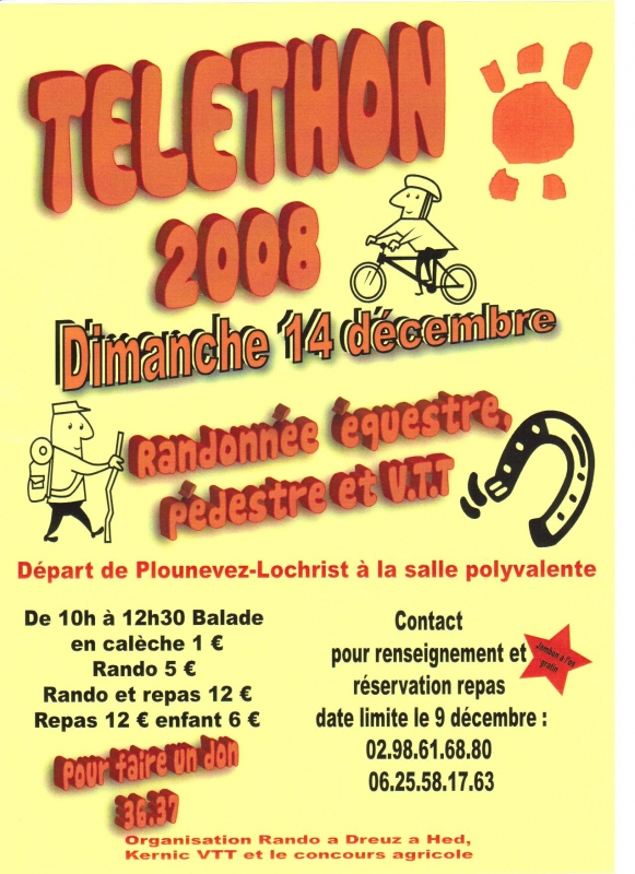| Description : | rando vtt, cheval et pédestre pour le téléthon, au départ de Plounévez-Lochist . rando 5€, repas et rando 12 €, repas seul, 12€, 6€ pour les enfants. |